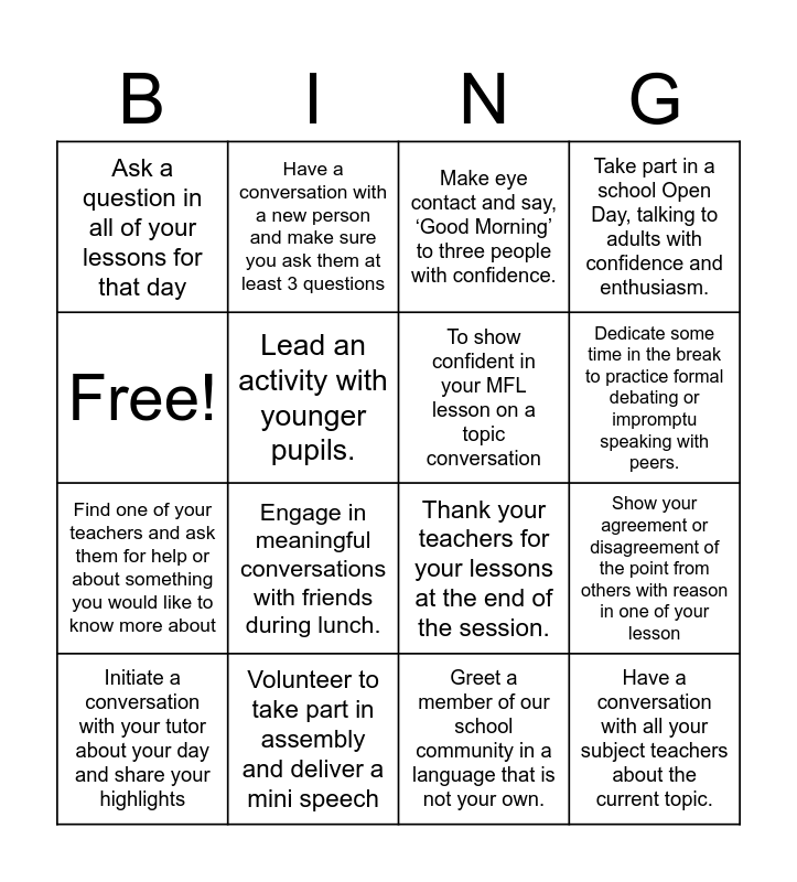 This bingo card has 16 words: Volunteer to take part in assembly and deliver a mini speech, Show your agreement or disagreement of the point from others with reason in one of your lesson, Make eye contact and say, ‘Good Morning’ to three people with confidence., Ask a question in all of your lessons for that day, Find one of your teachers and ask them for help or about something you would like to know more about, Have a conversation with a new person and make sure you ask them at least 3 questions, Thank your teachers for your lessons at the end of the session., Greet a member of our school community in a language that is not your own., Free!, Lead an activity with younger pupils., Initiate a conversation with your tutor about your day and share your highlights, Take part in a school Open Day, talking to adults with confidence and enthusiasm., Engage in meaningful conversations with friends during lunch., Dedicate some time in the break to practice formal debating or impromptu speaking with peers., To show confident in your MFL lesson on a topic conversation and Have a conversation with all your subject teachers about the current topic..