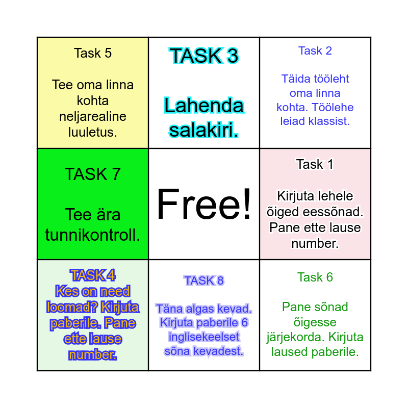 This bingo card has a free space and 8 words: Task 1 Kirjuta lehele õiged eessõnad. Pane ette lause number., Task 2 Täida tööleht oma linna kohta. Töölehe leiad klassist., TASK 3 Lahenda salakiri., TASK 4 Kes on need loomad? Kirjuta paberile. Pane ette lause number., Task 5 Tee oma linna kohta neljarealine luuletus., Task 6 Pane sõnad õigesse järjekorda. Kirjuta laused paberile., TASK 7 Tee ära tunnikontroll. and TASK 8 Täna algas kevad. Kirjuta paberile 6 inglisekeelset sõna kevadest..