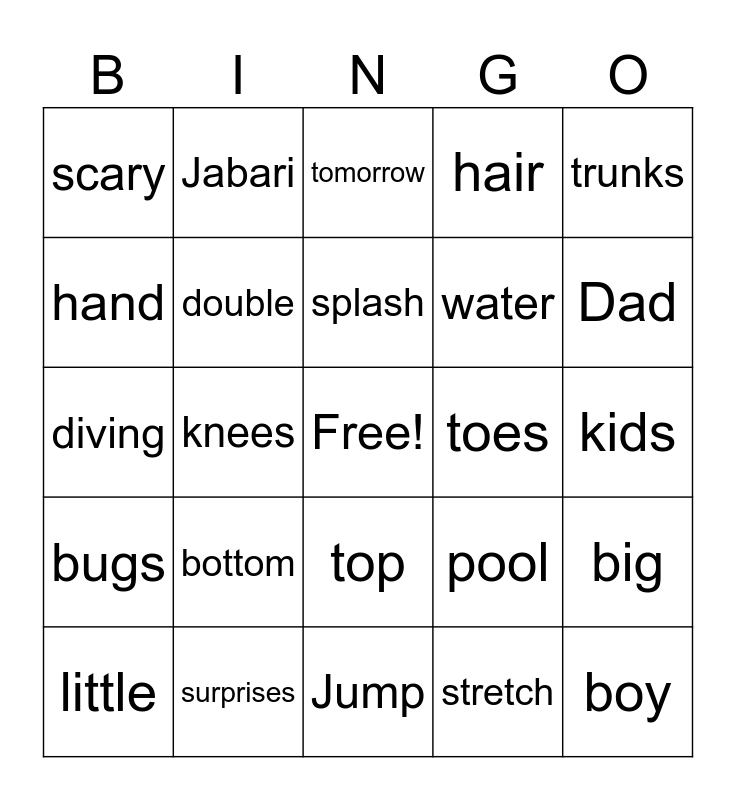 This bingo card has a free space and 43 words: sister, boy, girl, little, tired, stretch, tomorrow, googles, trunks, surprises, hair, toes, top, bottom, flying, Jump, Bravery, diving, board, Dad, Jabari, Brother, swimming, scary, great, kids, climb, ladder, pool, bugs, tiny, big, arms, knees, sprang, up, down, splash, hand, water, whoosh, double and backflip.