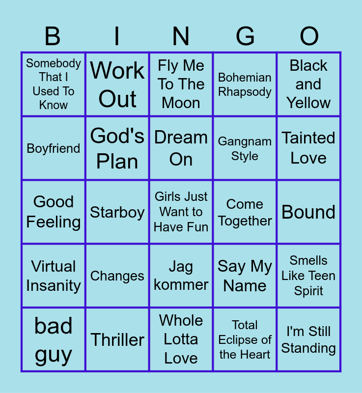 This bingo card has 30 words: Thriller, Shape of You, Starboy, On The Floor, Somebody That I Used To Know, Fly Me To The Moon, God's Plan, Jag kommer, Come Together, Whole Lotta Love, Bound, Girls Just Want to Have Fun, Total Eclipse of the Heart, I'm Still Standing, Tainted Love, No Scrubs, Say My Name, Virtual Insanity, Changes, Black and Yellow, Good Feeling, How To Love, Work Out, Gangnam Style, Boyfriend, Bohemian Rhapsody, Smells Like Teen Spirit, bad guy, Dream On and I Will Survive.