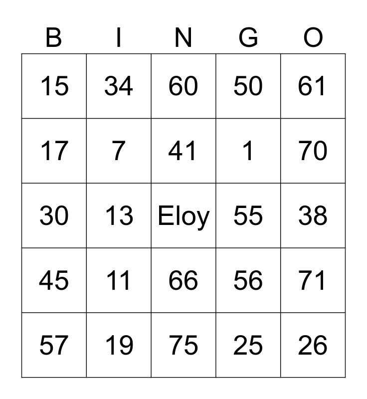 This bingo card has a free space and 24 words: 11, 19, 41, 57, 61, 15, 17, 34, 55, 66, 1, 30, 56, 71, 7, 25, 38, 60, 70, 13, 26, 45, 50 and 75.