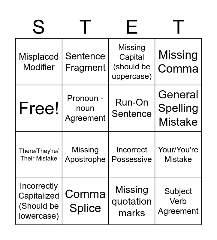 This bingo card has 16 words: Comma Splice, Your/You're Mistake, Missing Capital (should be uppercase), Misplaced Modifier, There/They're/ Their Mistake, Sentence Fragment, Incorrect Possessive, Missing quotation marks, Free!, Pronoun - noun Agreement, Incorrectly Capitalized (Should be lowercase), Missing Comma, Missing Apostrophe, General Spelling Mistake, Run-On Sentence and Subject Verb Agreement.