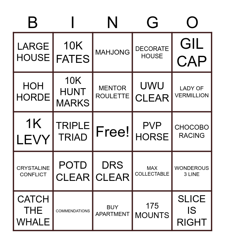 This bingo card has a free space and 24 words: POTD CLEAR, COMMENDATIONS, MENTOR ROULETTE, CATCH THE WHALE, GIL CAP, LARGE HOUSE, HOH HORDE, 10K FATES, PVP HORSE, DRS CLEAR, UWU CLEAR, 1K LEVY, MAX COLLECTABLE, WONDEROUS 3 LINE, 10K HUNT MARKS, 175 MOUNTS, CHOCOBO RACING, MAHJONG, LADY OF VERMILLION, TRIPLE TRIAD, SLICE IS RIGHT, CRYSTALINE CONFLICT, DECORATE HOUSE and BUY APARTMENT.