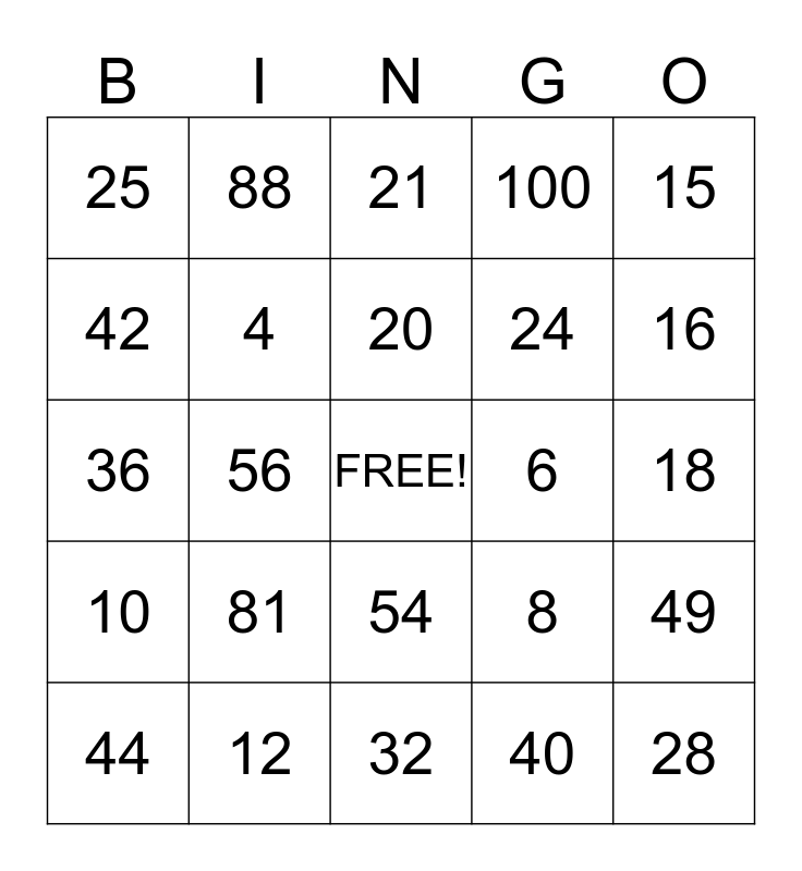 This bingo card has a free space and 24 words: 81, 12, 20, 44, 15, 25, 42, 88, 6, 54, 24, 36, 8, 49, 4, 40, 18, 21, 16, 56, 28, 10, 100 and 32.