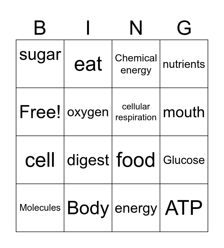 This bingo card has 16 words: Body, Glucose, Chemical energy, sugar, cell, eat, food, energy, Free!, oxygen, Molecules, nutrients, digest, mouth, cellular respiration and ATP.