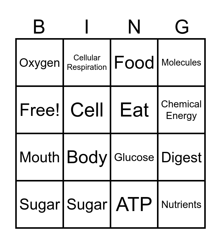 This bingo card has 16 words: Sugar, Digest, Food, Oxygen, Mouth, Cellular Respiration, Glucose, ATP, Free!, Cell, Sugar, Molecules, Body, Chemical Energy, Eat and Nutrients.