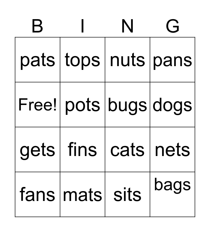 This bingo card has 16 words: mats, nets, nuts, pats, gets, tops, cats, sits, Free!, pots, fans, pans, fins, dogs, bugs and bags.