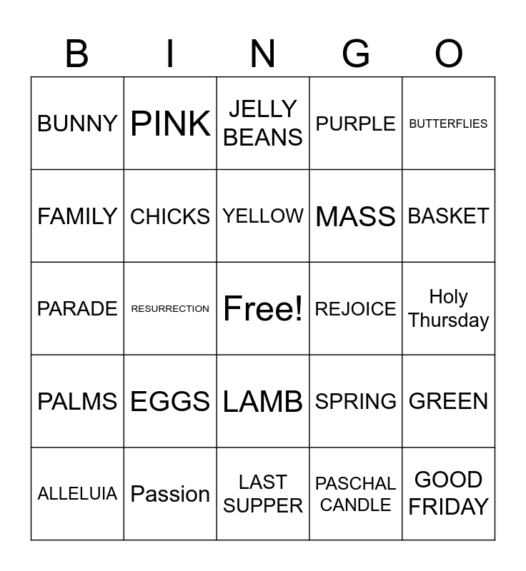 This bingo card has a free space and 29 words: ALLELUIA, CROSS, RESURRECTION, WHITE LILIES, BUNNY, JELLY BEANS, CHICKS, EGGS, REJOICE, Passion, Holy Thursday, GOOD FRIDAY, LAST SUPPER, PASCHAL CANDLE, BASKET, CHOCOLATE CANDY, LAMB, PALMS, BUTTERFLIES, PARADE, SPRING, EUCHARIST, MASS, FAMILY, PURPLE, PINK, GREEN, YELLOW and TULIPS.