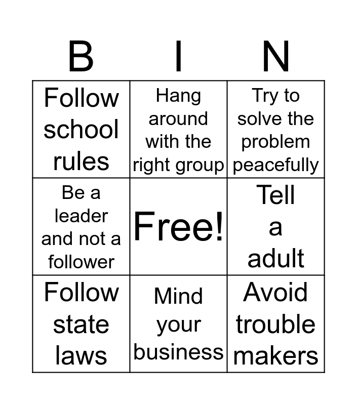 This bingo card has a free space and 8 words: Tell a adult, Try to solve the problem peacefully, Hang around with the right group, Follow state laws, Follow school rules, Avoid trouble makers, Be a leader and not a follower and Mind your business.