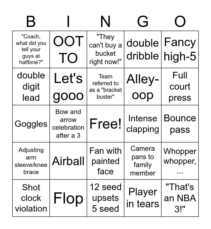 This bingo card has a free space and 24 words: Airball, Flop, Team referred to as a "bracket buster", Shot clock violation, Fancy high-5, "Coach, what did you tell your guys at halftime?", double digit lead, OOT TO, Intense clapping, Fan with painted face, Alley-oop, Goggles, Camera pans to family member, Whopper whopper, ..., Let's gooo, Player in tears, Bounce pass, "They can't buy a bucket right now!", Full court press, Bow and arrow celebration after a 3, "That's an NBA 3!", Adjusting arm sleeve/knee brace, double dribble and 12 seed upsets 5 seed.