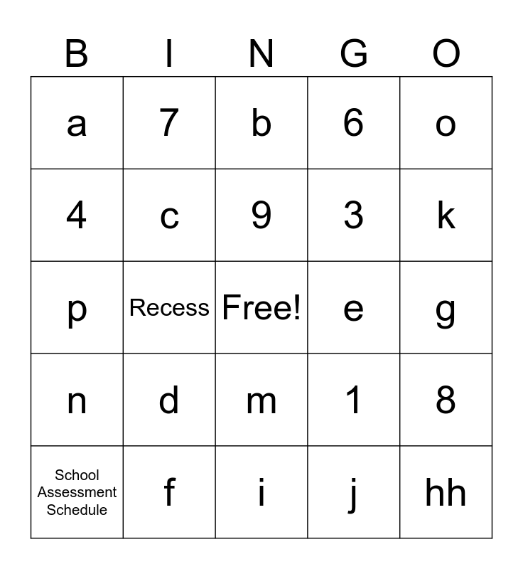 This bingo card has a free space and 29 words: School Assessment Schedule, Schedule, Recess, w, a, b, c, d, e, f, g, hh, i, j, k, l, m, n, o, p, 1, 2, 3, 4, 6, 7, 8, 9 and 10.