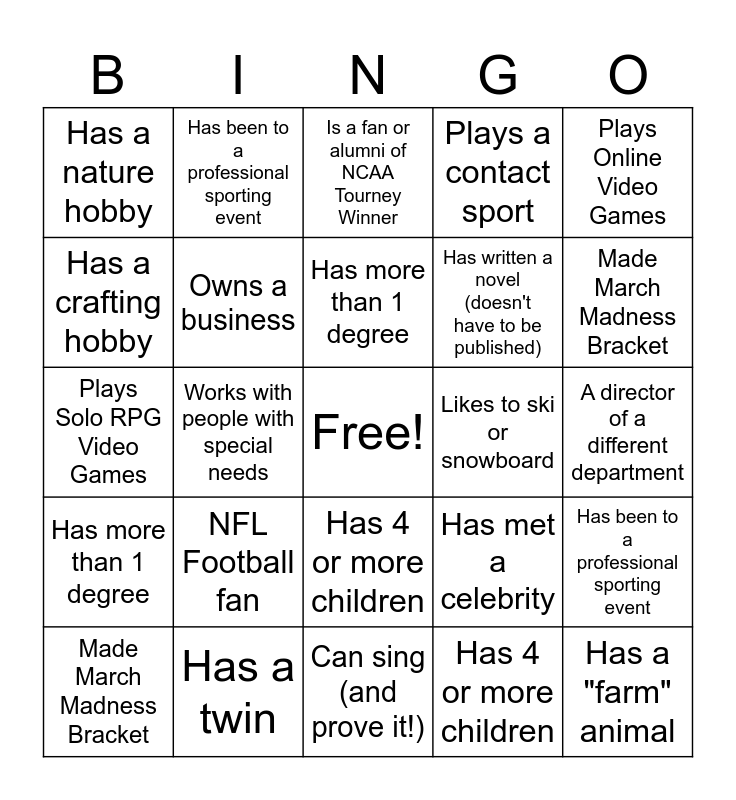 This bingo card has a free space and 100 words: Someone with an exotic pet, Someone with an education in chemistry, A director of a different department, Traveled out of country in the last year, Has an unopened email over a year old, Plays a contact sport, Speaks another language, Can drive stick-shift/manual car, Plays an instrument, Is an only child, Has run a marathon, Left Handed, Has a tattoo, Has a twin, Chess Player, Cosplayer, Has written a novel (doesn't have to be published), Has the same favorite color, Someone with a similar function outside of your org, Plays pickleball, plays a no contact sport, Watches college basketball, NFL Football fan, Born outside of US, Has watched a movie >10 times, Likes to ski or snowboard, Plays Online Video Games, Has met a celebrity, Has a crafting hobby, Grows their own food, Works with people with special needs, Has a nature hobby, Has a "farm" animal, Has 4 or more pets, Has 4 or more children, Has more than 1 degree, Has been to a professional sporting event, Has a publication outside of Labcorp, Has trained a new employee, Has cooked a meal for coworkers, Owns a business, Has visited a National Park, Plays Solo RPG Video Games, Lives within 10 minutes of Office, Made March Madness Bracket, Is a fan or alumni of NCAA Tourney Winner, Has lived/lives in another country, Participates in a Social Sport League, Can change a tire, Can sing (and prove it!), Someone with an education in chemistry, A director of a different department, Traveled out of country in the last year, Has an unopened email over a year old, Someone with an exotic pet, Speaks another language, Can drive stick-shift/manual car, Plays an instrument, Is an only child, Plays a contact sport, Left Handed, Has a tattoo, Has a twin, Chess Player, Has run a marathon, Has written a novel (doesn't have to be published), Has the same favorite color, Someone with a similar function outside of your org, Plays pickleball, Cosplayer, Watches college basketball, NFL Football fan, Born outside of US, Has watched a movie >10 times, plays a no contact sport, Plays Online Video Games, Has met a celebrity, Has a crafting hobby, Grows their own food, Likes to ski or snowboard, Has a nature hobby, Has a "farm" animal, Has 4 or more pets, Has 4 or more children, Works with people with special needs, Has been to a professional sporting event, Has a publication outside of Labcorp, Has trained a new employee, Has cooked a meal for coworkers, Has more than 1 degree, Has visited a National Park, Plays Solo RPG Video Games, Lives within 10 minutes of Office, Made March Madness Bracket, Owns a business, Has lived/lives in another country, Participates in a Social Sport League, Can change a tire, Can sing (and prove it!) and Is a fan or alumni of NCAA Tourney Winner.
