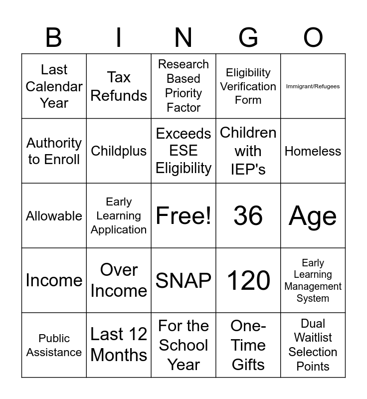 This bingo card has a free space and 38 words: PSESD, Eligibility, Recruitment, Selection, Enrollment, Attendance, Martha Waiters, Childplus, Early Learning Management System, Over Income, Exceeds ESE Eligibility, Children Impacted by Opportunity Gap, Immigrant/Refugees, Children with IEP's, Early Learning Application, Eligibility Verification Form, Dual Waitlist Selection Points, Age, Authority to Enroll, Income, Family Size, Research Based Priority Factor, 100, 36, Last Calendar Year, Last 12 Months, Homeless, Public Assistance, Foster Care/Kinship, For the School Year, 101%-130% FPG, 15, 3, Parent/Guardian living in same household as child, 50% or more financial support, SNAP, One-Time Gifts, Tax Refunds, Income Statement, 120, Allowable and 1000.