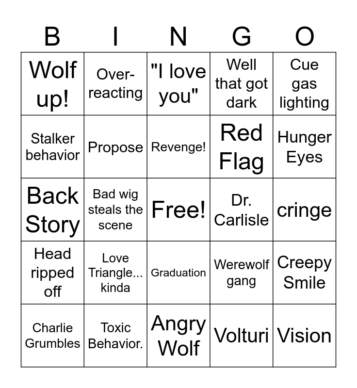 This bingo card has a free space and 24 words: Love Triangle... kinda, Toxic Behavior., Revenge!, Charlie Grumbles, Cue gas lighting, Wolf up!, Stalker behavior, Over-reacting, Dr. Carlisle, Graduation, Red Flag, Back Story, Werewolf gang, Creepy Smile, Propose, Volturi, cringe, "I love you", Hunger Eyes, Bad wig steals the scene, Vision, Head ripped off, Well that got dark and Angry Wolf.
