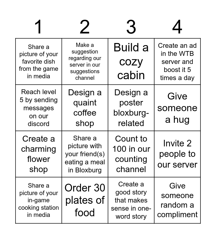 This bingo card has 16 words: Order 30 plates of food, Invite 2 people to our server, Build a cozy cabin, Share a picture of your favorite dish from the game in media, Create a charming flower shop, Make a suggestion regarding our server in our suggestions channel, Count to 100 in our counting channel, Create a good story that makes sense in one-word story, Reach level 5 by sending messages on our discord, Design a quaint coffee shop, Share a picture of your in-game cooking station in media, Create an ad in the WTB server and boost it 5 times a day, Share a picture with your friend(s) eating a meal in Bloxburg, Give someone a hug, Design a poster bloxburg-related and Give someone random a compliment.