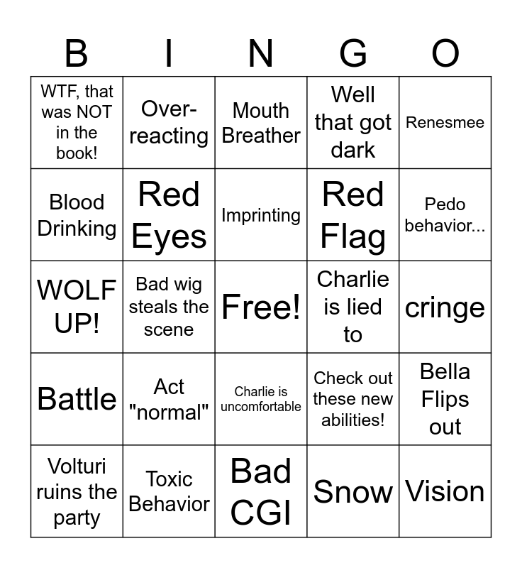 This bingo card has a free space and 24 words: Act "normal", Toxic Behavior, Imprinting, Volturi ruins the party, Renesmee, WTF, that was NOT in the book!, Blood Drinking, Over-reacting, Charlie is lied to, Charlie is uncomfortable, Red Flag, WOLF UP!, Check out these new abilities!, Bella Flips out, Red Eyes, Snow, cringe, Mouth Breather, Pedo behavior..., Bad wig steals the scene, Vision, Battle, Well that got dark and Bad CGI.