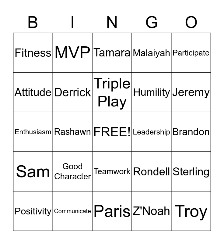This bingo card has a free space and 24 words: Good Character, Communicate, Triple Play, Positivity, Participate, Fitness, Attitude, MVP, Leadership, Teamwork, Humility, Enthusiasm, Rondell, Sterling, Derrick, Z'Noah, Brandon, Tamara, Jeremy, Rashawn, Troy, Sam, Malaiyah and Paris.