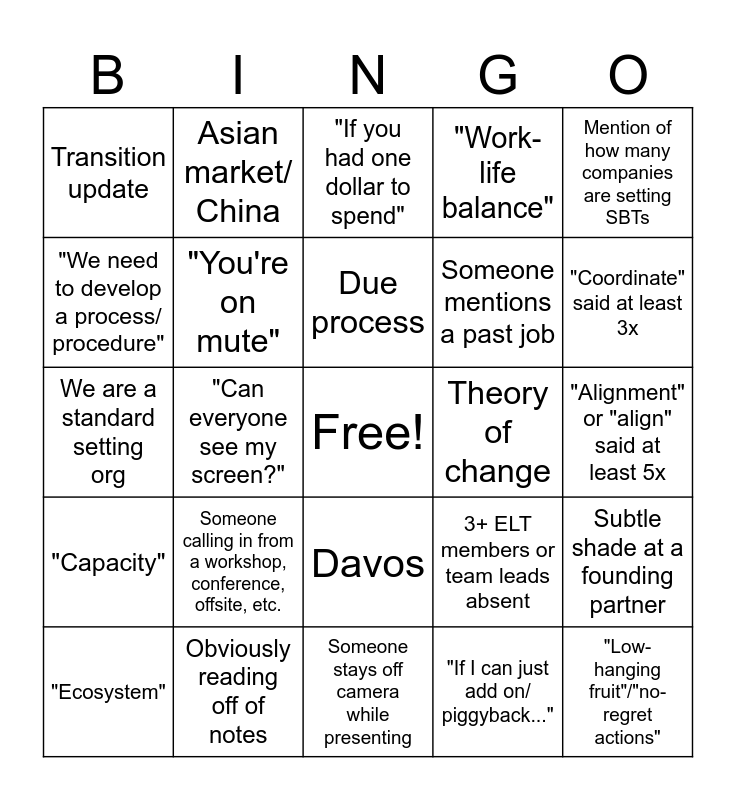 This bingo card has a free space and 26 words: Davos, "If I can just add on/ piggyback...", Due process, Obviously reading off of notes, Mention of how many companies are setting SBTs, Transition update, "We need to develop a process/ procedure", Asian market/ China, "Alignment" or "align" said at least 5x, 3+ ELT members or team leads absent, Someone mentions a past job, We are a standard setting org, Subtle shade at a founding partner, "Ecosystem", "Can everyone see my screen?", "Give everyone back [x] minutes", "Work-life balance", "Capacity", "If you had one dollar to spend", "Low-hanging fruit"/"no-regret actions", "Coordinate" said at least 3x, Someone stays off camera while presenting, Theory of change, Someone calling in from a workshop, conference, offsite, etc., "You're on mute" and Someone curses.