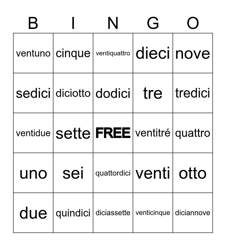 This bingo card has a free space and 25 words: sei, diciassette, dodici, due, nove, ventuno, sedici, cinque, ventitré, quattordici, tre, ventidue, venti, otto, diciotto, undici, quattro, ventiquattro, tredici, sette, diciannove, quindici, uno, dieci and venticinque.
