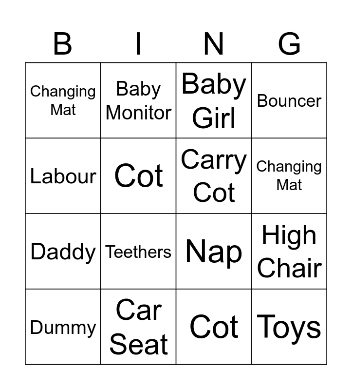 ⚠ This card has duplicate items: Baby (2), Baby Book (2), Baby Girl (2), Baby Lotion (2), Baby Monitor (2), Baby Shower (2), Bib (2), Blanket (2), Booties (2), Bottle (2), Bouncer (2), Calpol (2), Carry Cot (2), Car Seat (2), Changing Bag (2), Changing Mat (2), Comforter (2), Cot (2), Crawling (2), Crying (2), Cuddles (2), Daddy (2), Dummy (2), Health Visitor (2), High Chair (2), Hooded Towel (2), Labour (2), Milk (2), Moses Basket (2), Mummy (2), Muslin (2), Nappy (2), Nappy Cream (2), Nap (2), Night Light (2), Pushchair (2), Sleepsuit (2), Sling (2), Teethers (2), Toys (2), Vest (2), Wipes (2)