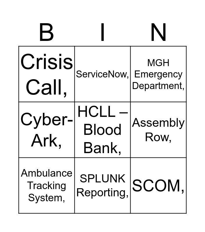 This bingo card has 24 words: Clarity,, System Pulse,, SPLUNK Reporting,, RSA – VPN,, HCLL – Blood Bank,, Crisis Call,, Assembly Row,, ServiceNow,, EPIC,, SCCM,, SCOM,, Command Center,, OBIX – Fetal Monitoring,, Enterprise Data Warehouse,, Ambulance Tracking System,, PeopleSoft,, Provation,, MGH Emergency Department,, Patient Keeper,, Patient Gateway,, Suncrest Pharmacy,, LifeTrack – Blood Donation,, Cyber-Ark, and PAS.