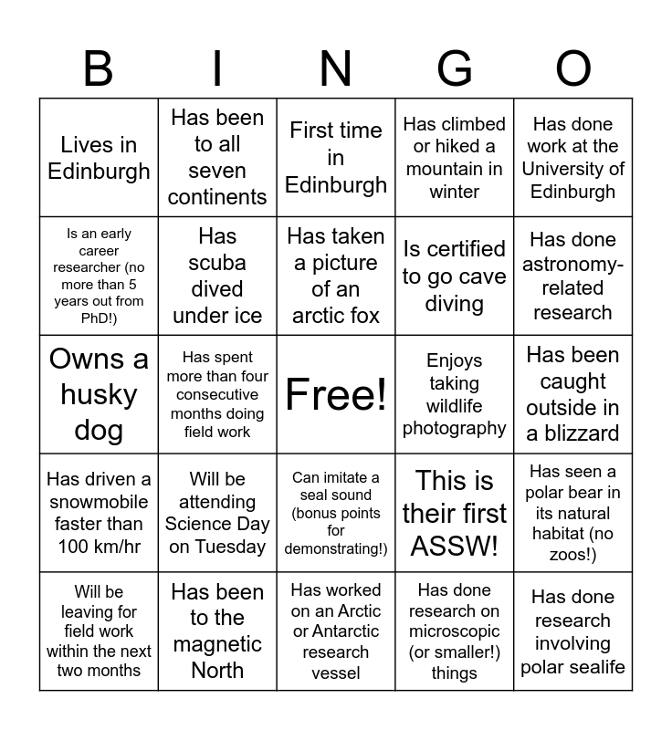 This bingo card has a free space and 30 words: Has been to the magnetic North, Has been to Antarctica, Has spent more than four consecutive months doing field work, Has flown in a helicopter, Lives in Edinburgh, First time in Edinburgh, Has scuba dived under ice, Can imitate a seal sound (bonus points for demonstrating!), Enjoys taking wildlife photography, Has worked on an Arctic or Antarctic research vessel, Has been caught outside in a blizzard, Has done research involving polar sealife, Has done research on microscopic (or smaller!) things, Has seen the Aurora Borealis, Has done astronomy-related research, Has been to at least one previous ASSW conference, This is their first ASSW!, Has driven a snowmobile faster than 100 km/hr, Will be attending Science Day on Tuesday, Has done work at the University of Edinburgh, Owns a husky dog, Can start a fire without a lighter or matches, Has been to all seven continents, Is certified to go cave diving, Is an early career researcher (no more than 5 years out from PhD!), Has climbed or hiked a mountain in winter, Has seen a polar bear in its natural habitat (no zoos!), Will be leaving for field work within the next two months, Has taken a picture of an arctic fox and Studies glaciers.