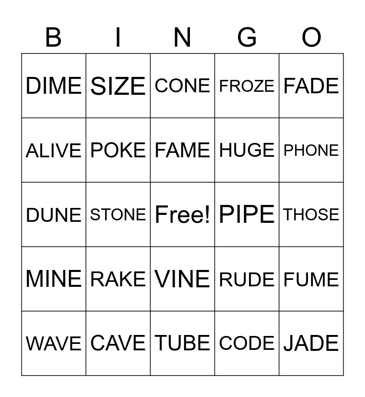 This bingo card has a free space and 24 words: RAKE, CAVE, FAME, WAVE, FADE, DIME, ALIVE, SIZE, PIPE, VINE, HUGE, DUNE, RUDE, FUME, POKE, CODE, THOSE, CONE, PHONE, STONE, JADE, MINE, FROZE and TUBE.
