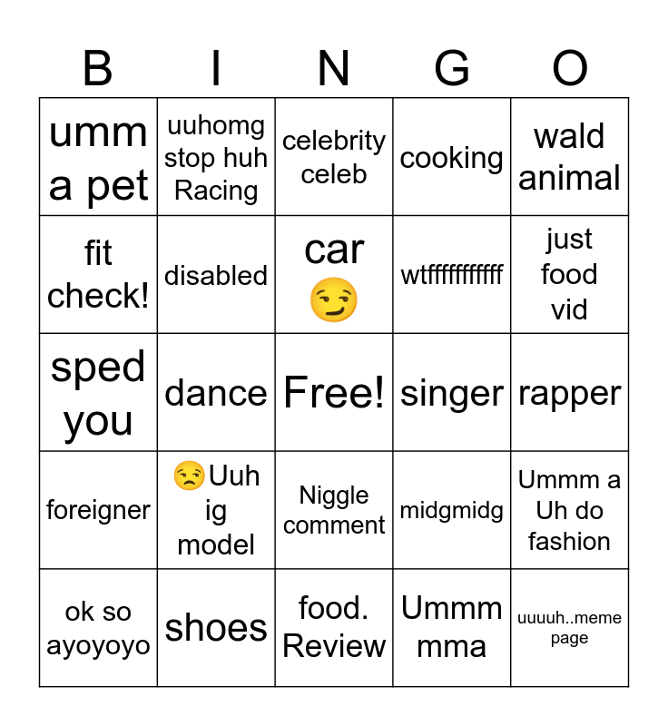 This bingo card has a free space and 24 words: ok so ayoyoyo, 😒Uuh ig model, car😏, Ummm mma, wald animal, umm a pet, uuhomg stop huh Racing, celebrity celeb, singer, rapper, sped you, disabled, midgmidg, Ummm a Uh do fashion, fit check!, shoes, food. Review, cooking, just food vid, foreigner, dance, Niggle comment, wtfffffffffff and uuuuh..meme page.