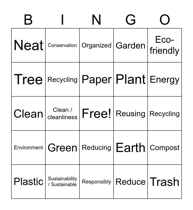 This bingo card has a free space and 30 words: Sustainability / Sustainable, Order, Clean / cleanliness, Pure, Neat, Organized, Recycling, Reducing, Reusing, Responsibly, Recycling, Trash, Reduce, Reuse, Energy, Water, Earth, Environment, Green, Eco-friendly, Clean, Pollution, Conservation, Plant, Tree, Garden, Compost, Plastic, Paper and Bottle.
