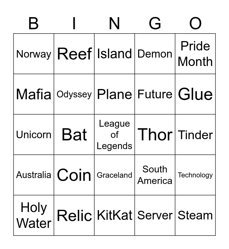 This bingo card has 25 words: Coin, KitKat, Plane, Holy Water, Pride Month, Norway, Mafia, Reef, Thor, Graceland, Future, Unicorn, South America, Technology, Odyssey, Steam, Tinder, Island, Glue, Bat, League of Legends, Relic, Australia, Demon and Server.