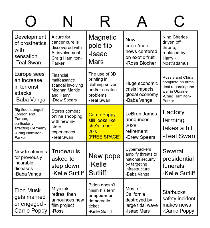 This bingo card has a free space and 44 words: Jimmy Carter (sadly) dies -Ross Blocher, Starbucks safety incident makes news -Carrie Poppy, Trump gives up politics and turns to painting -Carrie Poppy, Elon Musk gets married or engaged -Carrie Poppy, Bob Newhart (sadly) dies -Carrie Poppy, Most of California destroyed by large tidal wave -Isaac Mars, Magnetic pole flip -Isaac Mars, U.S. has its first female president -Jemima Packington, King Charles driven off throne, replaced by Harry -Nostradamus, Miyazaki retires, then announces new film project -Ross, New craze/major news centered on exotic fruit -Ross Blocher, LeBron James announces 2028 retirement -Drew Spears, New pope -Kelle Sutliff, Trudeau is asked to step down -Kelle Sutliff, Biological weapons test or nuke attack by a big country -Baba Vanga, Biden doesn't finish his term or appear on democratic ticket -Kelle Sutliff, Putin has major health crisis in May-August -Kelle Sutliff, Big floods engulf London and Europe, particularly affecting Germany -Craig Hamilton-Parker, Big earthquake on American west coast reaching Mexico City -Craig Hamilton-Parker, Russia and China complete an arms deal regarding the war in Ukraine -Craig Hamilton-Parker, A cure for cancer cure is discovered with AI involvement -Craig Hamilton-Parker, Spyware release brings down banking system -Craig Hamilton-Parker, Police develop new tech to gain public trust, but secretly militarize further -Teal Swan, Development of prosthetics with sensation -Teal Swan, Millennials adopt new health wave of zero proof drinks and drinking less -Michelle Welch, Factory farming takes a hit -Teal Swan, Orbital change occurs -Baba Vanga, Russian president is assassinated by someone from his country -Baba Vanga, Cyberhackers amplify threats to national security by targeting infrastructure -Baba Vanga, New treatments for previously incurable diseases -Baba Vanga, Seperations and divorces within the English royal family -Jemima Packington, Several presidential funerals -Kelle Sutliff, Kamala Harris has a VERY short run as president -Kelle Sutliff, April and May are good months for "all of us" -Michelle Welch, Stores combat online shopping with new in-store experiences -Teal Swan, Police use AI to predict crime patterns; focus on prevention, not punishment -Teal Swan, Newsworthy earthquake in America and Italy -Craig Hamilton-Parker, High-profile and/or well-paid TV personality loses job -Debbie Malone/ Jemima Packington, The use of 3D printing in clothing solves and/or creates problems -Teal Swan, Europe sees an increase in terrorist attacks -Baba Vanga, Huge economic crisis impacts global economy -Baba Vanga, Big and exclusively Christian revival wave -Kathryn Krick, Financial malfeasance scandal involving Meghan Markle and Harry -Drew Spears and Something terrible happens to a cast member of Friends -Ross Blocher.