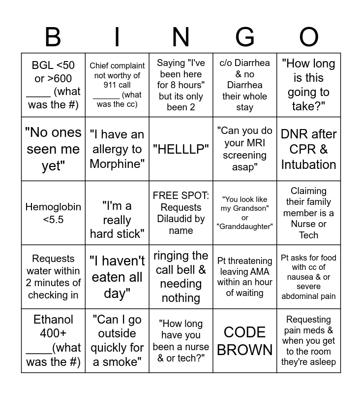 This bingo card has a free space and 24 words: "I haven't eaten all day", "Can I go outside quickly for a smoke", "HELLLP", Ethanol 400+ ____(what was the #), "How long is this going to take?", BGL <50 or >600 ____ (what was the #), "No ones seen me yet", Chief complaint not worthy of 911 call ______ (what was the cc), "You look like my Grandson" or "Granddaughter", ringing the call bell & needing nothing, "Can you do your MRI screening asap", Hemoglobin <5.5, Pt threatening leaving AMA within an hour of waiting, Pt asks for food with cc of nausea & or severe abdominal pain, "I have an allergy to Morphine", CODE BROWN, Claiming their family member is a Nurse or Tech, Saying "I've been here for 8 hours" but its only been 2, DNR after CPR & Intubation, "I'm a really hard stick", Requesting pain meds & when you get to the room they're asleep, Requests water within 2 minutes of checking in, c/o Diarrhea & no Diarrhea their whole stay and "How long have you been a nurse & or tech?".