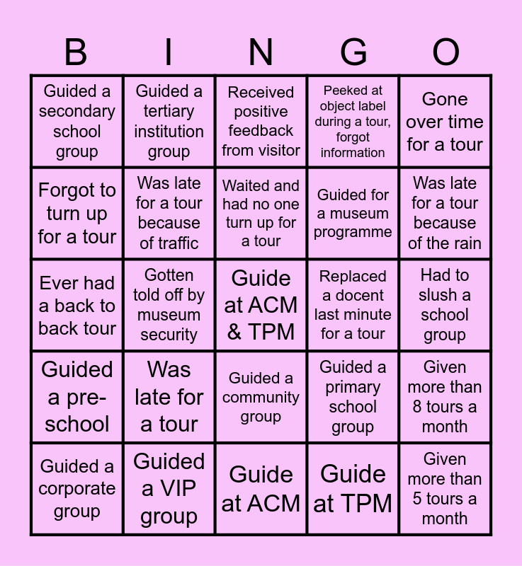This bingo card has a free space and 24 words: Was late for a tour, Guided a VIP group, Waited and had no one turn up for a tour, Guided a corporate group, Gone over time for a tour, Guided a secondary school group, Forgot to turn up for a tour, Guided a tertiary institution group, Replaced a docent last minute for a tour, Guided a community group, Guided for a museum programme, Ever had a back to back tour, Guided a primary school group, Given more than 8 tours a month, Was late for a tour because of traffic, Guide at TPM, Had to slush a school group, Received positive feedback from visitor, Was late for a tour because of the rain, Gotten told off by museum security, Given more than 5 tours a month, Guided a pre-school, Peeked at object label during a tour, forgot information and Guide at ACM.