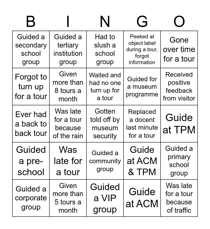This bingo card has 25 words: Was late for a tour, Guided a VIP group, Waited and had no one turn up for a tour, Guided a corporate group, Gone over time for a tour, Guided a secondary school group, Forgot to turn up for a tour, Guided a tertiary institution group, Replaced a docent last minute for a tour, Guided a community group, Guided for a museum programme, Ever had a back to back tour, Guide at ACM & TPM, Guided a primary school group, Given more than 8 tours a month, Was late for a tour because of traffic, Guide at TPM, Had to slush a school group, Received positive feedback from visitor, Was late for a tour because of the rain, Gotten told off by museum security, Given more than 5 tours a month, Guided a pre-school, Peeked at object label during a tour, forgot information and Guide at ACM.