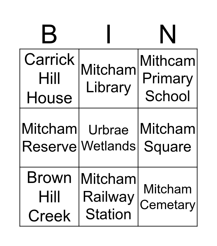 This bingo card has a free space and 8 words: Mitcham Square, Mithcam Primary School, Mitcham Library, Brown Hill Creek, Carrick Hill House, Mitcham Cemetary, Mitcham Reserve and Mitcham Railway Station.