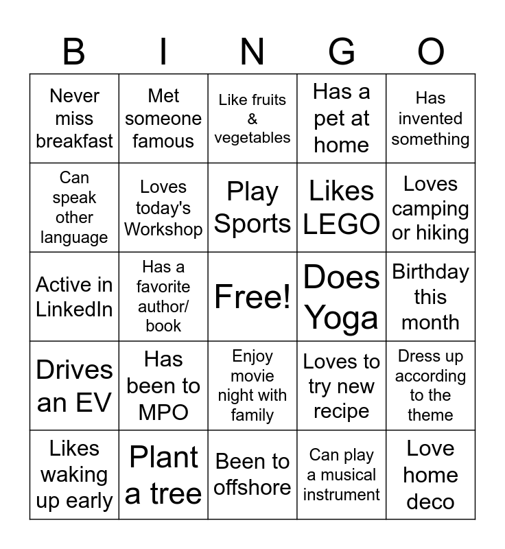 This bingo card has a free space and 24 words: Has been to MPO, Plant a tree, Play Sports, Likes waking up early, Has invented something, Never miss breakfast, Can speak other language, Met someone famous, Does Yoga, Enjoy movie night with family, Likes LEGO, Active in LinkedIn, Loves to try new recipe, Dress up according to the theme, Loves today's Workshop, Can play a musical instrument, Birthday this month, Like fruits & vegetables, Loves camping or hiking, Has a favorite author/ book, Love home deco, Drives an EV, Has a pet at home and Been to offshore.