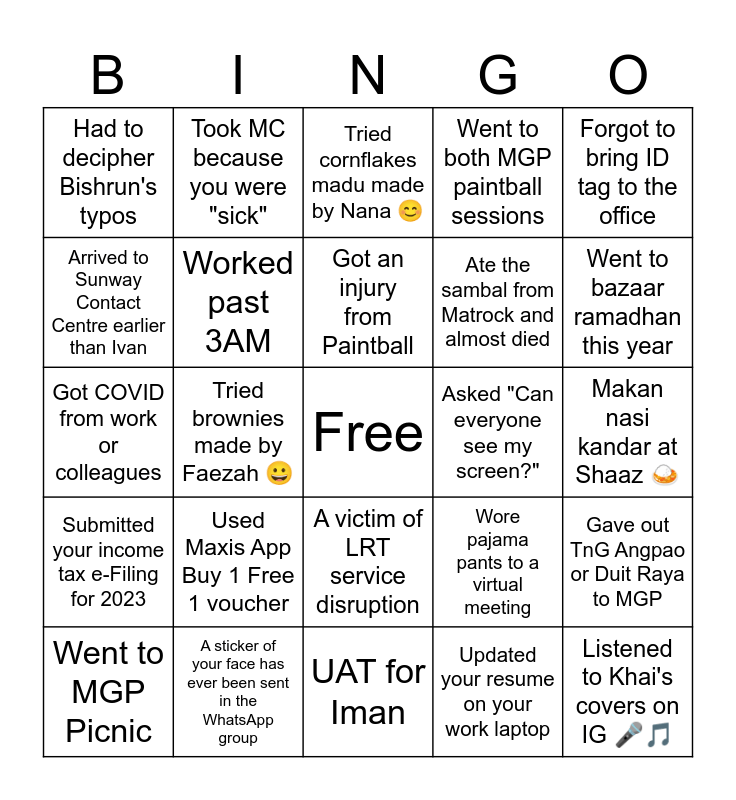 This bingo card has a free space and 24 words: Used Maxis App Buy 1 Free 1 voucher, A sticker of your face has ever been sent in the WhatsApp group, Got an injury from Paintball, Went to MGP Picnic, Forgot to bring ID tag to the office, Had to decipher Bishrun's typos, Arrived to Sunway Contact Centre earlier than Ivan, Took MC because you were "sick", Asked "Can everyone see my screen?", A victim of LRT service disruption, Ate the sambal from Matrock and almost died, Got COVID from work or colleagues, Wore pajama pants to a virtual meeting, Gave out TnG Angpao or Duit Raya to MGP, Worked past 3AM, Updated your resume on your work laptop, Makan nasi kandar at Shaaz 🍛, Tried cornflakes madu made by Nana 😊, Went to bazaar ramadhan this year, Tried brownies made by Faezah 😀, Listened to Khai's covers on IG 🎤🎵, Submitted your income tax e-Filing for 2023, Went to both MGP paintball sessions and UAT for Iman.