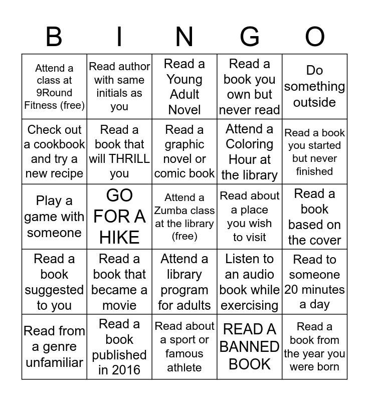 This bingo card has a free space and 24 words: Read a book that became a movie, Read a book published in 2016, Read a graphic novel or comic book, Read from a genre unfamiliar, Do something outside, Attend a class at 9Round Fitness (free), Check out a cookbook and try a new recipe, Read author with same initials as you, Read about a place you wish to visit, Attend a library program for adults, Attend a Coloring Hour at the library, Play a game with someone, Listen to an audio book while exercising, Read to someone 20 minutes a day, Read a book that will THRILL you, READ A BANNED BOOK, Read a book based on the cover, Read a Young Adult Novel, Read a book you started but never finished, GO FOR A HIKE, Read a book from the year you were born, Read a book suggested to you, Read a book you own but never read and Read about a sport or famous athlete.