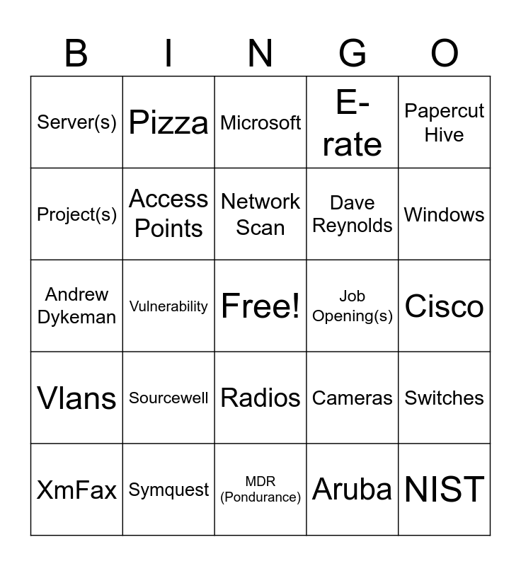This bingo card has a free space and 24 words: Sourcewell, Symquest, Network Scan, XmFax, Papercut Hive, Server(s), Project(s), Pizza, Job Opening(s), Radios, Dave Reynolds, Andrew Dykeman, Cameras, Switches, Access Points, Aruba, Cisco, Microsoft, Windows, Vulnerability, NIST, Vlans, E-rate and MDR (Pondurance).