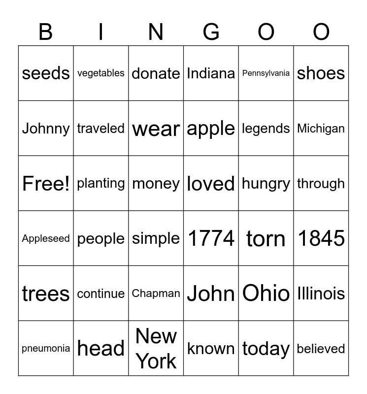 This bingo card has 36 words: John, Chapman, known, Johnny, Appleseed, loved, traveled, New York, Pennsylvania, Ohio, Michigan, Indiana, Illinois, planting, apple, seeds, trees, hungry, Free!, donate, money, people, 1774, simple, torn, vegetables, legends, head, wear, shoes, believed, pneumonia, 1845, through, continue and today.