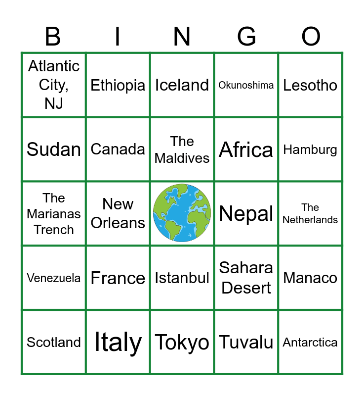 This bingo card has a free space and 29 words: Scotland, Iran, New Orleans, Ecuador, Atlantic City, NJ, Iceland, Canada, France, Nepal, Italy, The Netherlands, Antarctica, Tokyo, Tuvalu, Hamburg, Greenland, Istanbul, Venezuela, Lesotho, The Marianas Trench, Sahara Desert, Dubai, Africa, Sudan, Okunoshima, Ethiopia, Manaco, The Maldives and China.
