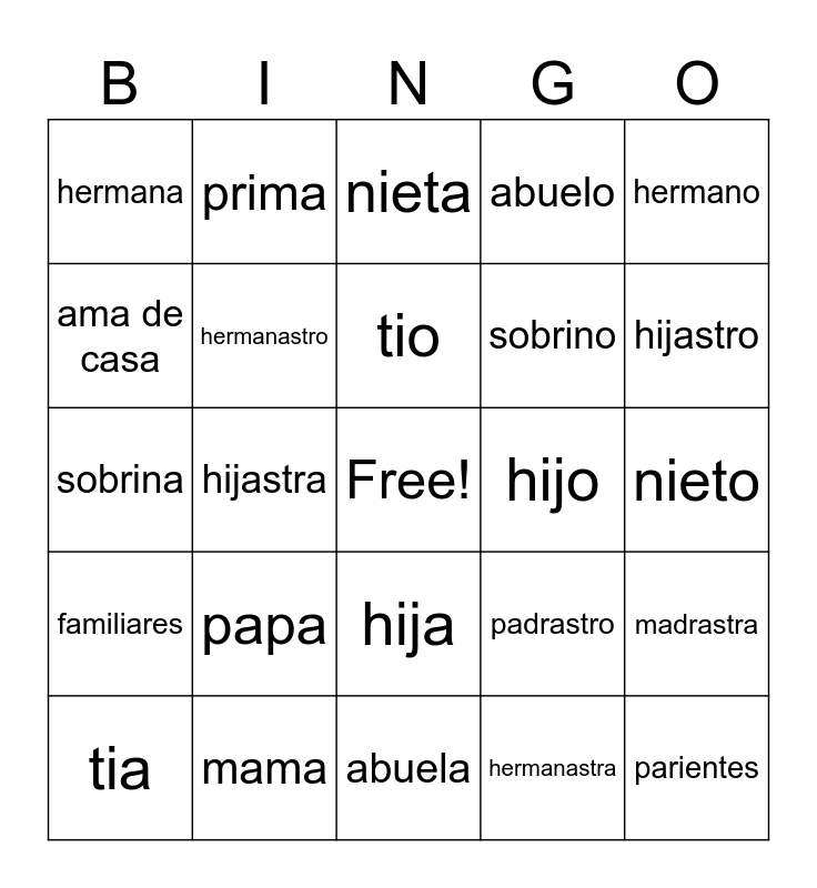 This bingo card has a free space and 24 words: papa, mama, tio, tia, hermano, hermana, ama de casa, prima, hijo, hija, sobrino, sobrina, padrastro, madrastra, hermanastro, hermanastra, nieto, nieta, hijastro, hijastra, parientes, familiares, abuelo and abuela.