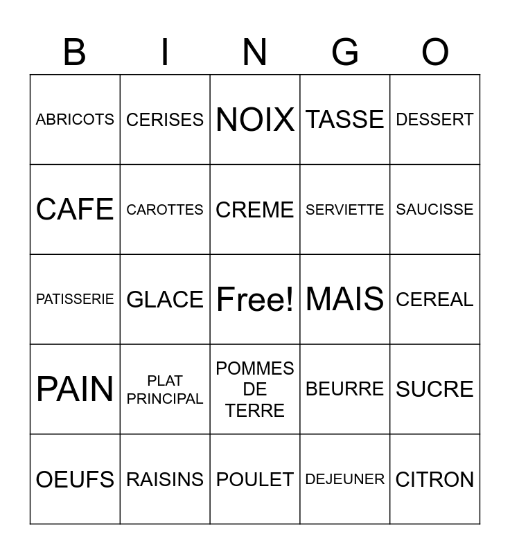 This bingo card has a free space and 73 words: HORS D'OEUVRE, POMME, ABRICOTS, BACON, BANANE, HARICOTS, PAIN, PETIT DEJEUNER, BEURRE, CHOU, GATEAU, BONBONS, CAROTTES, CEREAL, FROMAGE, CERISES, POULET, CAFE, BISCUITS, MAIS, CREME, TASSE, DESSERT, DINER, OEUFS, POISSON, FOURCHETTE, FRITES FRANCAISES, FRUIT, VERRE, RAISINS, JAMBON, HAMBURGER, HOT DOG, GLACE, CONFITURE, JUS, COUTEAU, CITRON, LAITUE, DEJEUNER, PLAT PRINCIPAL, VIANDE, MELON, LAIT, SERVIETTE, NOIX, OIGNON, ORANGE, PATISSERIE, PECHES, POIR, PETIT POIS, TARTE, ANANAS, ASSIETTE, PRUNES, POMMES DE TERRE, RIZ, SALADE, SEL ET POIVRE, SANDWICH, SOUCOUPE, SAUCISSE, SOUPE, CUILLERE, STEAK, FRAISES, SUCRE, THE, TOMATES, EAU and PASTEQUE.