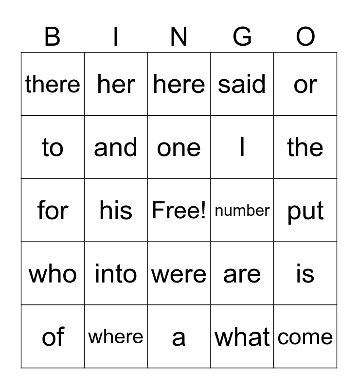 This bingo card has a free space and 24 words: into, where, one, of, or, there, to, her, number, were, I, for, are, is, and, what, put, here, the, his, come, who, said and a.