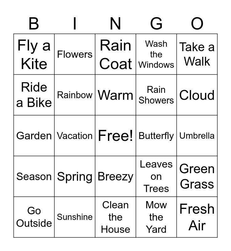 This bingo card has a free space and 24 words: Spring, Sunshine, Warm, Go Outside, Take a Walk, Fly a Kite, Ride a Bike, Flowers, Butterfly, Breezy, Rain Showers, Garden, Leaves on Trees, Green Grass, Rainbow, Mow the Yard, Umbrella, Rain Coat, Cloud, Vacation, Fresh Air, Season, Wash the Windows and Clean the House.
