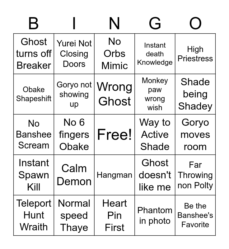 This bingo card has a free space and 24 words: Calm Demon, Normal speed Thaye, Wrong Ghost, Teleport Hunt Wraith, High Priestress, Ghost turns off Breaker, Obake Shapeshift, Yurei Not Closing Doors, Way to Active Shade, Hangman, Monkey paw wrong wish, No Banshee Scream, Ghost doesn't like me, Far Throwing non Polty, Goryo not showing up, Phantom in photo, Goryo moves room, No Orbs Mimic, Shade being Shadey, No 6 fingers Obake, Be the Banshee's Favorite, Instant Spawn Kill, Instant death Knowledge and Heart Pin First.