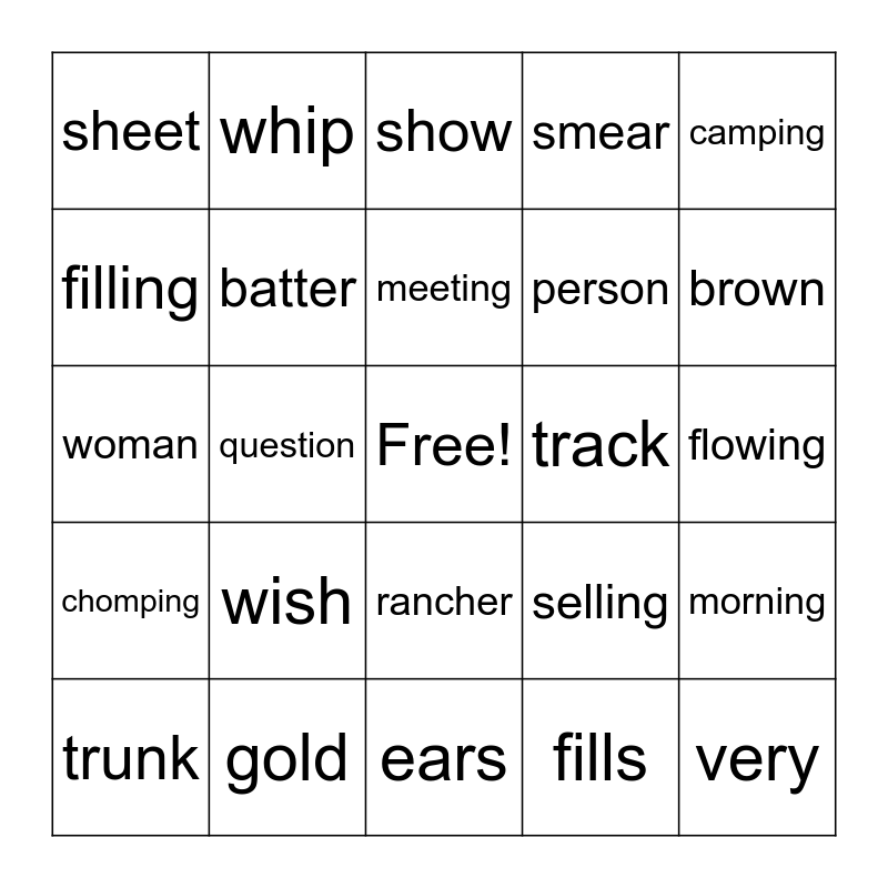 This bingo card has a free space and 24 words: wish, gold, meeting, trunk, camping, sheet, filling, whip, track, rancher, person, woman, selling, morning, batter, fills, flowing, show, brown, question, very, chomping, smear and ears.