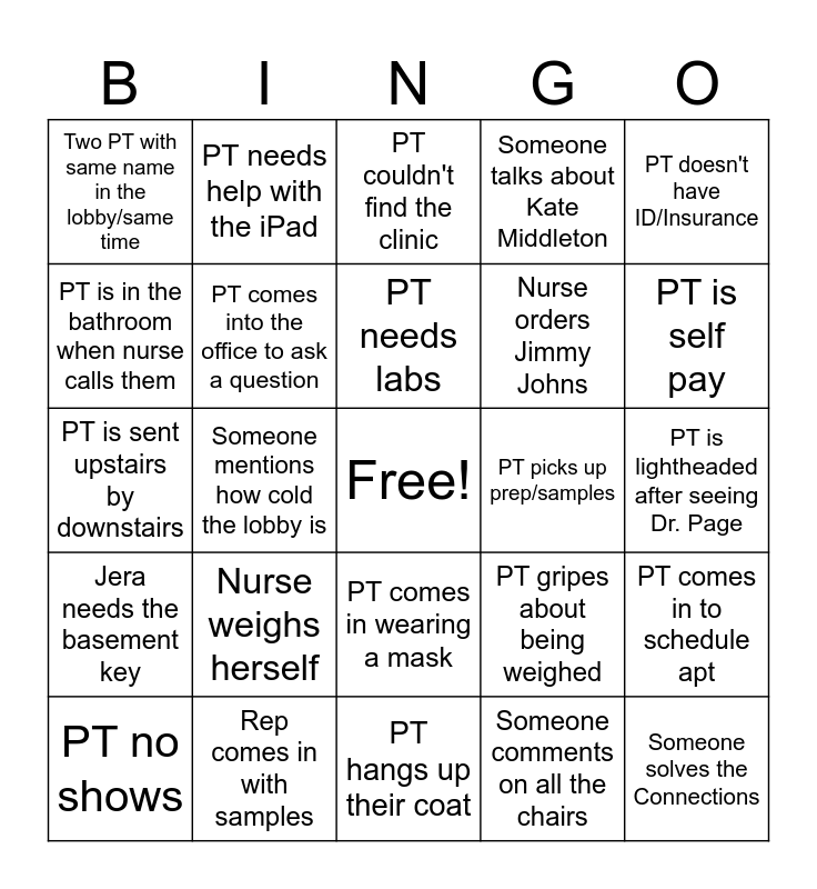 This bingo card has a free space and 24 words: Nurse weighs herself, Rep comes in with samples, PT needs labs, PT no shows, PT doesn't have ID/Insurance, Two PT with same name in the lobby/same time, PT is in the bathroom when nurse calls them, PT needs help with the iPad, PT picks up prep/samples, PT comes in wearing a mask, Nurse orders Jimmy Johns, PT is sent upstairs by downstairs, PT gripes about being weighed, PT comes in to schedule apt, PT comes into the office to ask a question, Someone comments on all the chairs, PT is lightheaded after seeing Dr. Page, PT couldn't find the clinic, PT is self pay, Someone mentions how cold the lobby is, Someone solves the Connections, Jera needs the basement key, Someone talks about Kate Middleton and PT hangs up their coat.