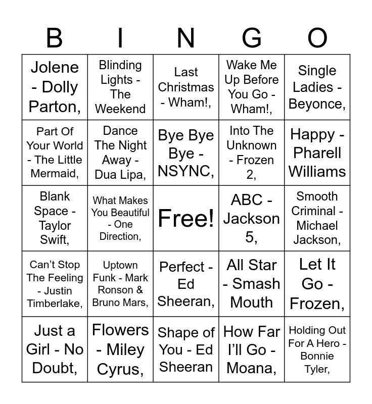 This bingo card has a free space and 40 words: Shake It Off - Taylor Swift,, Blank Space - Taylor Swift,, Problem - Ariana Grande,, Dance The Night Away - Dua Lipa,, Flowers - Miley Cyrus,, Perfect - Ed Sheeran,, Bye Bye Bye - NSYNC,, Wannabe - Spice Girls,, Single Ladies - Beyonce,, Can’t Stop The Feeling - Justin Timberlake,, What Makes You Beautiful - One Direction,, Wake Me Up Before You Go - Wham!,, Holding Out For A Hero - Bonnie Tyler,, Smooth Criminal - Michael Jackson,, ABC - Jackson 5,, Uptown Funk - Mark Ronson & Bruno Mars,, Good 4 U - Olivia Rodrigo,, Jolene - Dolly Parton,, Dancing Queen - ABBA,, Last Christmas - Wham!,, Let It Go - Frozen,, How Far I’ll Go - Moana,, Into The Unknown - Frozen 2,, Part Of Your World - The Little Mermaid,, I'll Make A Man Out Of You - Mulan,, You're Welcome - Moana,, Friend Like Me - Aladdin,, Bohemian Rhapsody - Queen,, We Will Rock You - Queen,, Another One Bites The Dust - Queen,, Centuries - Fall Out Boys,, Just a Girl - No Doubt,, Don’t Stop Believing - Journey,, All Star - Smash Mouth, Happy - Pharell Williams, Shape of You - Ed Sheeran, Anti-Hero - Taylor Swift, I ain’t worried - One Republic, Blinding Lights - The Weekend and Sunroof - Nicky Youre.