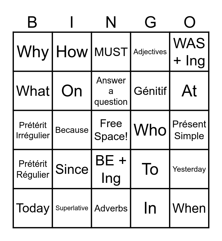 This bingo card has a free space and 30 words: Superlative, What time is it?, Because, SHOULD, Why, MUST, On, BE + Ing, Who, Adverbs, Présent Simple, When, In, CAN, At, Where, To, Prétérit Régulier, Since, WAS + Ing, Prétérit Irrégulier, "of", How, Génitif, What, Adjectives, Yesterday, Today, Answer a question and Ask a question.